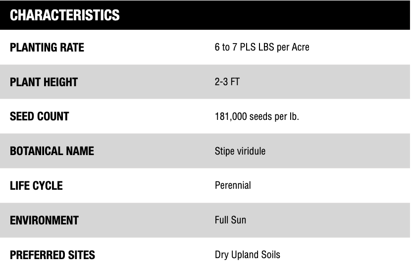 USES: Green Needle grass is well-suited for use in mixtures for range seeding, critical area establishment, mine land revegetation, wildlife habitat, and other plantings where the establishment of native vegetation is the objective. This species is nutritious, palatable, but decreases under grazing use. The awns are not as troublesome to livestock as with other needle grasses.